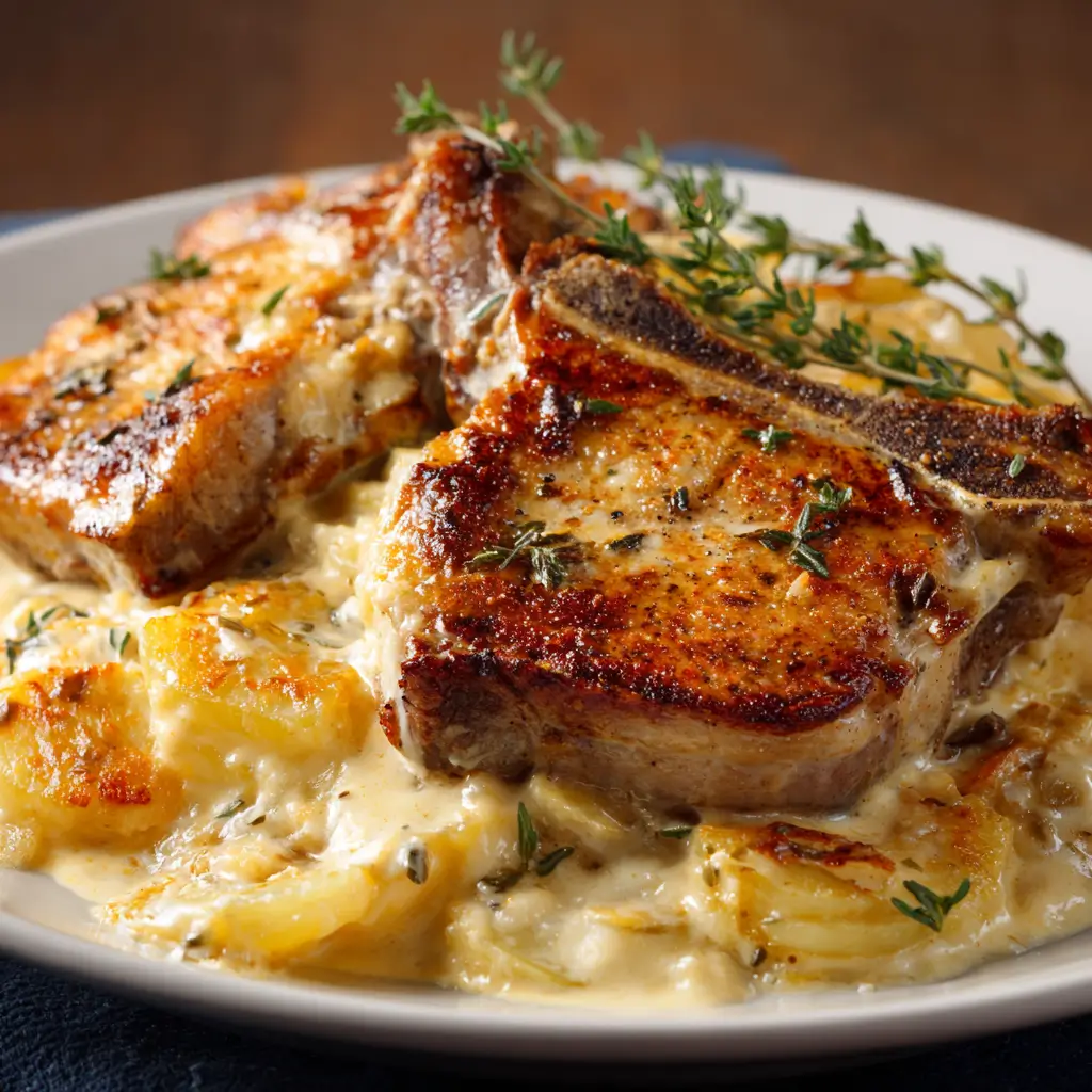 Creamy Pork Chops over Cheesy Scalloped Potatoes: A Comforting Family Favorite