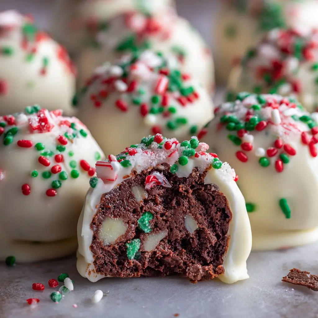 - Drizzle with White Chocolate: Melt the white chocolate chips in a separate bowl and drizzle over the coated brownie bombs. Sprinkle additional crushed candy canes on top for garnish.