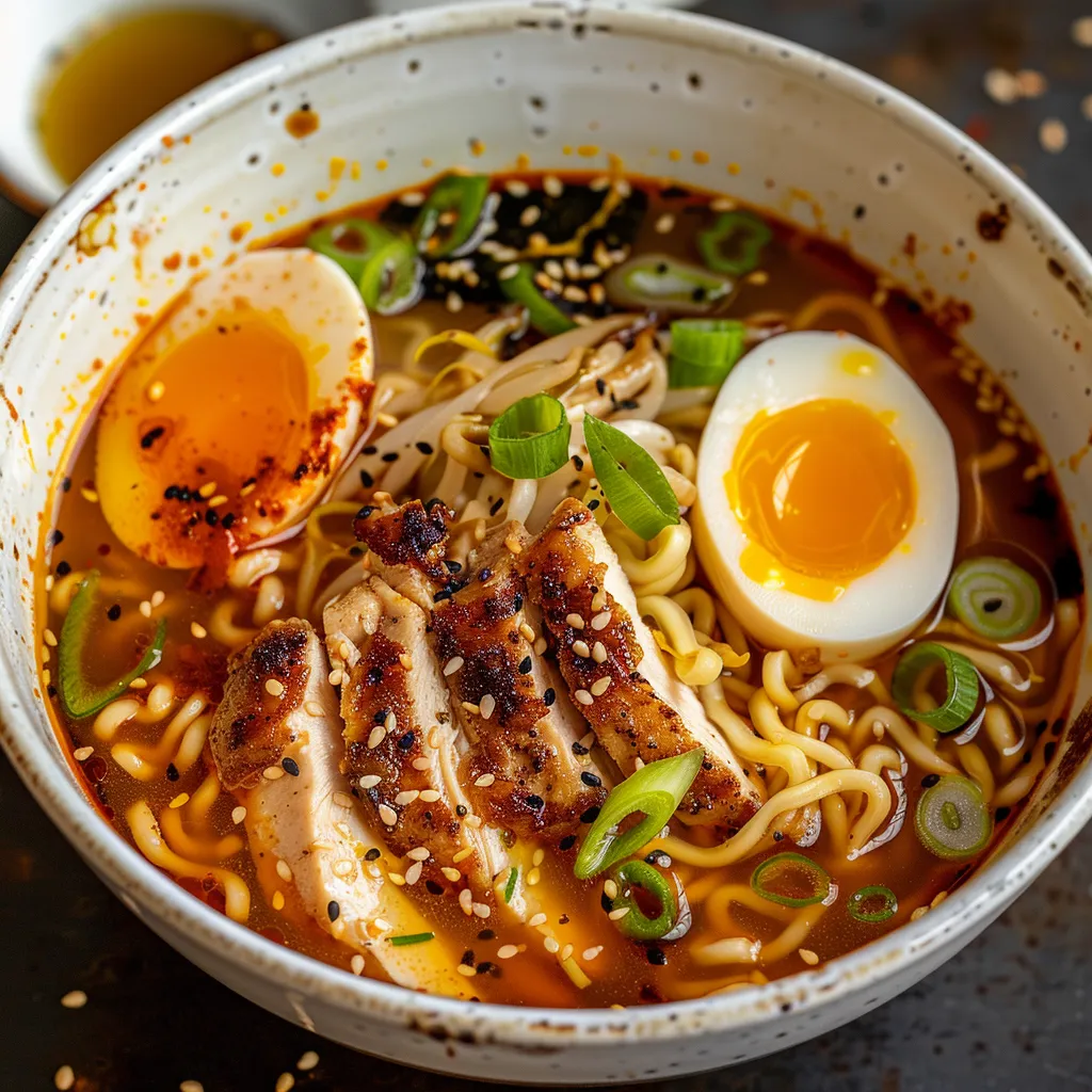 Ladle the ramen into bowls. Top each serving with sliced chicken, a soft-boiled egg, and a sprinkle of chopped green onions. Drizzle with sesame oil for extra flavor.