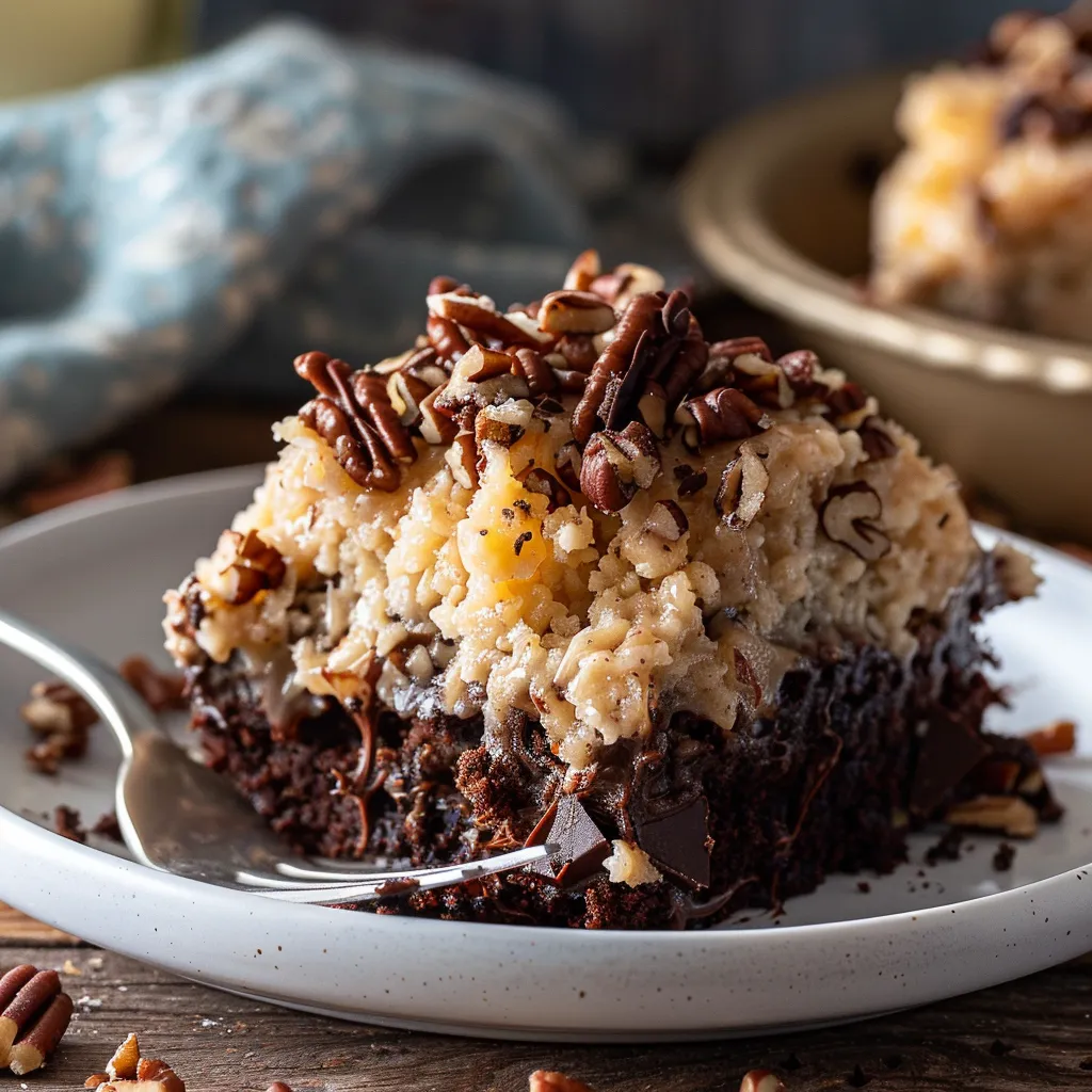 German Chocolate Poke Cake Recipe | Moist, Decadent, and Loaded with Gooey Coconut Frosting
