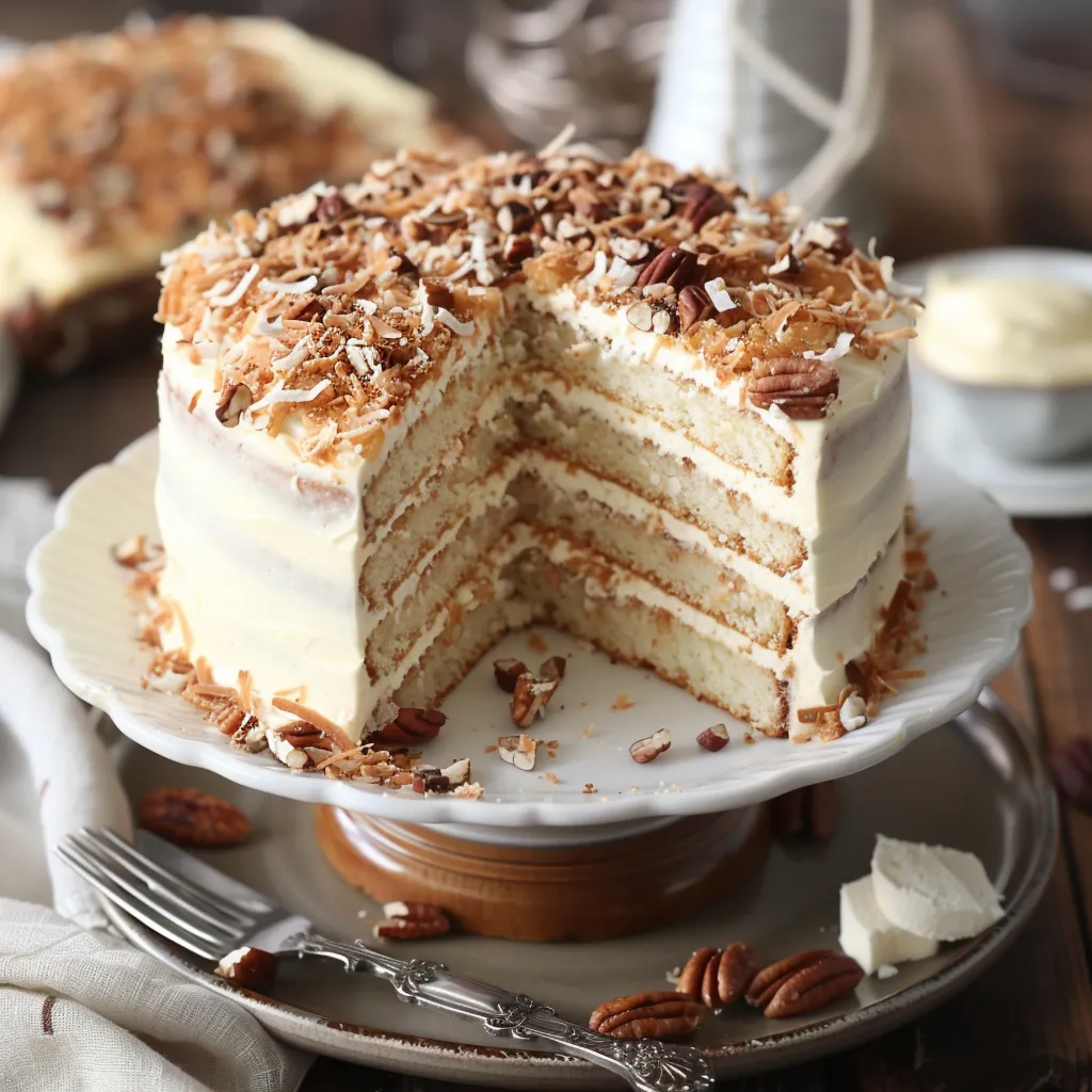 For a beautiful finish, sprinkle additional coconut and pecans on top of the frosted cake.
